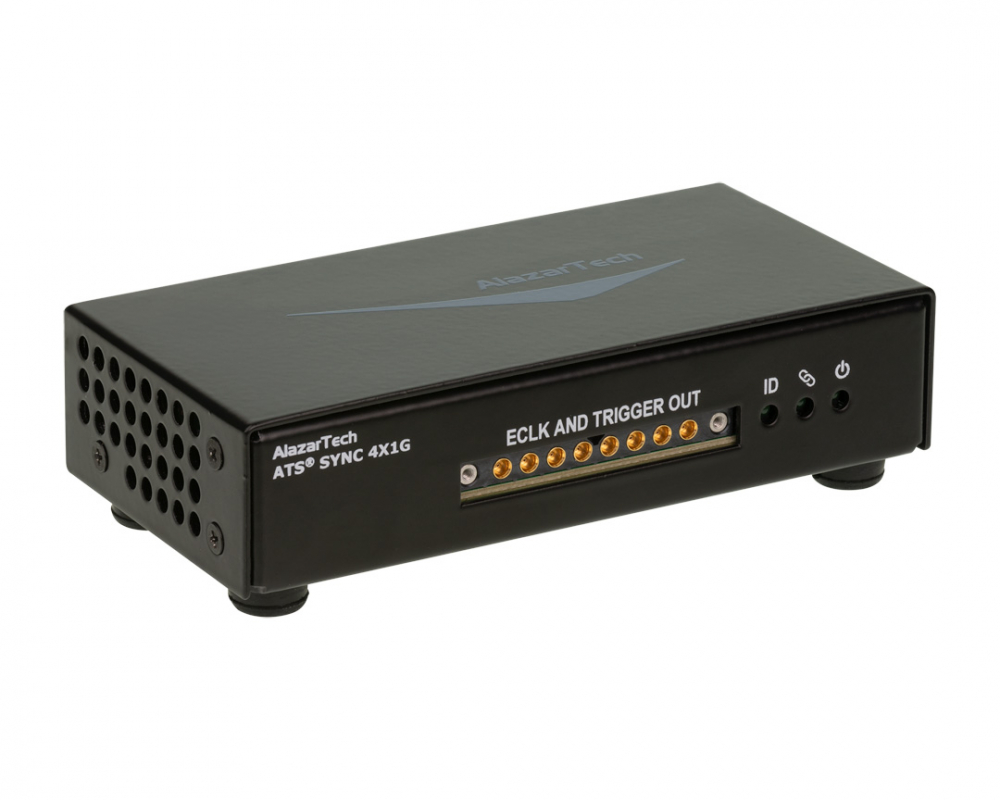 ATST146: Sync 4X1G is a device that allows simultaneous sampling across multiple independent AlazarTech ATST146 waveform digitizers. This is achieved by providing common clock and trigger signals to each digitizer.